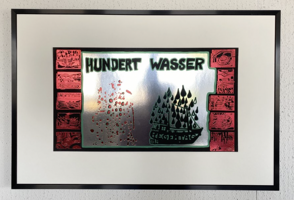Das ist das Ausstellungs-Plakat der Galerie H.Kamer 1957. Hundertwasser hat vor dem Druck die Ei-Tempera in brauner Farbe mit dem Spachtel auf das Papier aufgetragen. Danach wurde die Lithografie in grün und rot über die Ei-Tempera gedruckt. Wir haben hier ein Unikat Werk 305.